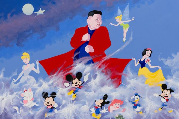 Sun Mu made this painting, Untitled, with what looks like acrylic on canvas and boy, it’s got a flat, graphic punch. The solid pink background sets off this kid giving Pluto a squeeze, and there are these cartoony flowers off to the side. Now, what gets me going is how clean the edges are, like cut paper. There is no messing around here, but there’s also this naive quality, the colours slightly off, the shapes kinda wonky. It’s like a dream, both perfect and totally weird. Check out Pluto's eyes, for example, one eye bigger than the other, that’s no mistake. It's about feeling, not getting it right. This tension makes me think of Phillip Guston, another artist who embraced the so-called "bad" and the raw. And that's what makes it so good. It's a reminder that art doesn't have to be slick to be powerful.