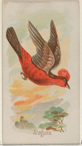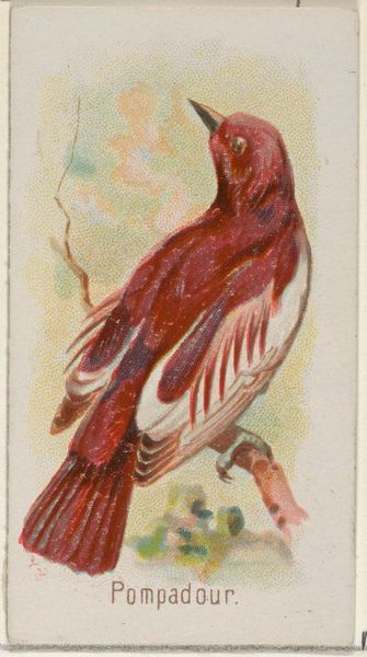 Editor: Here we have "Amandava, from the Song Birds of the World series (N23) for Allen & Ginter Cigarettes," made around 1890. The image is of a small, brilliantly colored bird perched on a branch. It's interesting that something so delicate was used to promote…cigarettes. What strikes you about this piece? Curator: What grabs me immediately is the production and distribution method. It’s a coloured-pencil drawing, reproduced as a print, inserted into cigarette packs as a collectible item. Allen & Ginter were blurring the lines between art, advertising, and consumerism. Were they thinking about labor exploitation in their manufacturing process, or about the environmental cost of producing these images on such a scale? Editor: I hadn't thought about that. So, it's not just a pretty picture; it represents this whole system of production and consumption. Curator: Precisely. And consider the materials. Coloured pencils, relatively cheap and easily accessible, but transformed through skilled labor into something of perceived value. This card becomes both art object and advertisement. Did this democratize art or degrade it? How did tobacco companies affect the making, buying, and selling of art? Editor: It's a fascinating collision of art, commerce, and… well, addiction. The small format almost makes it seem disposable, yet here we are discussing it over a century later. Curator: These cards also stimulated interest in ornithology among a broad public, but the end was also expanding global trade networks and consumption habits. Do you see a possible link there? Editor: That's… darker than I initially expected. Now, when I look at it, I'm seeing less of a charming bird and more of a symbol of mass production and early advertising strategies. Thank you for pointing that out! Curator: The point is to encourage dialogue on materials, production, consumption. This little bird really opens up a can of worms about how capitalist industries affect art!
