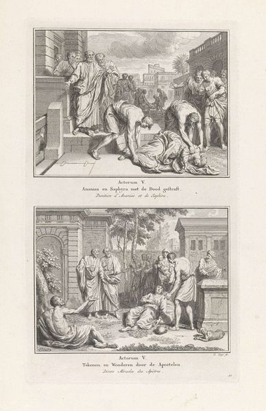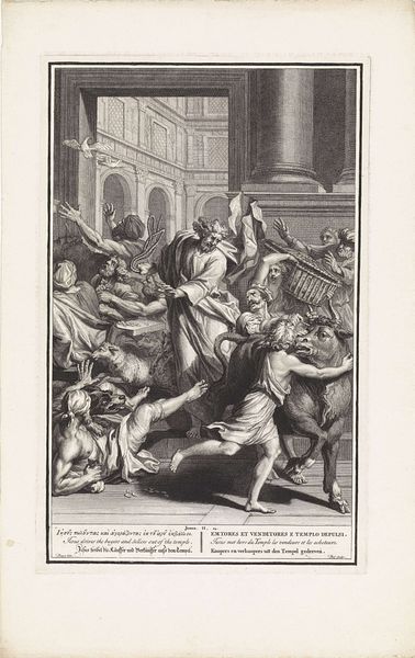 Curator: Looking at this engraving, “Geseling en Bespotting” from around 1700 by Joseph Mulder, the sharp lines and contrasts feel immediately dramatic. Editor: Dramatic is one word. My first impression is brutality rendered with a kind of cold, precise efficiency. The black and white amplifies the starkness. Makes me think about how readily violence can be manufactured and distributed...literally. Curator: Precisely! This print, like many of the period, wasn't created in a vacuum. It speaks to the broader system of printmaking and its role in disseminating religious narratives to a wide audience. Engravings allowed for mass production, turning potent religious imagery into a commodity. Think about the accessibility that brought. Editor: A commodity alright. But there's something chilling about packaging this specific scene, these images of torment, for easy consumption. I wonder who the target audience was? Piety driven by guilt? Or just a fascination with suffering, sanitized by art? Curator: Good point! While pinpointing the exact motivations of consumers is difficult centuries later, consider that prints were circulated among different classes and devotion obviously was key. Moreover, artists at the time operated within networks of workshops and patronage and often reproduced images. Here, Mulder is engaging with a pre-existing iconography, recasting it through his particular technical skill. Editor: And what skillful work! Those lines create such intense detail, almost clinical in their clarity. You see the whip cutting into the flesh. The sneers on the faces of the tormentors. Each mark carefully placed to maximize emotional impact. A product meticulously crafted, despite its troubling subject matter. Is the method somewhat divorced from the message, or reinforcing it, perhaps? Curator: It reinforces the message, but also reveals some of the mechanics behind it. By foregrounding the technical processes involved in production—engraving requires considerable labor—we realize how this image moved from artist's hand to printing press to market. It reveals the means by which beliefs were not just visualized but manufactured, and bought, shaping public opinion. Editor: It's quite an eerie realization, to think about faith itself being, in a sense, manufactured, piece by piece. Curator: Indeed. It prompts us to think critically about the power of images, both then and now, in constructing our realities and beliefs. Editor: So much encoded in a seemingly simple print. Thanks for untangling some of it with me.