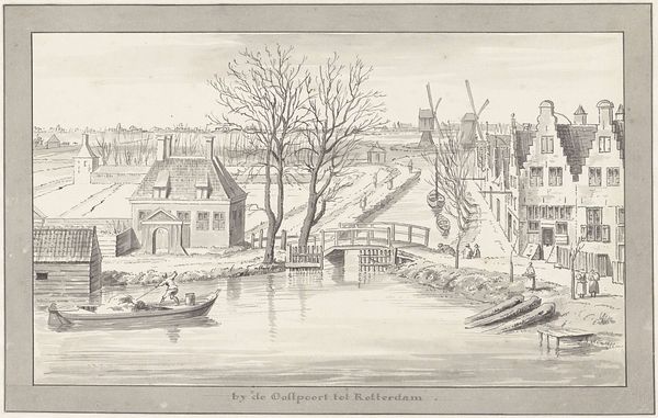 Curator: This is Cornelis Pronk’s "De stadswal van Rotterdam bij de Oostpoort," likely created sometime in the first half of the 18th century. Editor: There’s a striking calmness. The monochrome palette really brings a quiet, almost melancholic mood to this depiction of Rotterdam. Curator: The work reflects Pronk's engagement with representing urban spaces. As part of a broader trend in the Dutch Golden Age, there's an emphasis here on the civic and social environment. Notice how the "stadswal," the city rampart, blends into the domestic architecture? Editor: Right, and the paper and ink themselves invite closer examination. Look at the way the artist uses line work to differentiate texture, to create an illusion of depth… I wonder about Pronk's technique here – what sort of nib was he using? And how did the availability and cost of paper influence the scale and detail of works like this? Curator: It’s interesting you bring up materials. Consider the broader context – the Dutch Golden Age and its flourishing trade networks enabled wider access to these very materials, which subsequently shaped artistic practice and styles. Editor: Exactly, the material conditions allowed artists to iterate styles such as those prevalent in Dutch Golden Age, contributing to this cityscape style. Also, these ramshackle, almost improvised structures near the water...were these temporary structures associated with the maintenance of the wall and harbor? Curator: It's likely many of those are related to trade and harbour activity, definitely underscoring the dynamism of Rotterdam's growth at the time. Editor: The perspective almost centers the waterways rather than buildings; it is a portrait of trade made from ink and paper. What an elegant, subtle reminder of how material realities shape a city’s identity. Curator: I appreciate how that point highlights the role images play in shaping our understanding and cultural narrative of urban space, particularly in periods of rapid transformation. Editor: Absolutely. Considering these production elements offers fresh insight into art’s dialogue with society and history.
