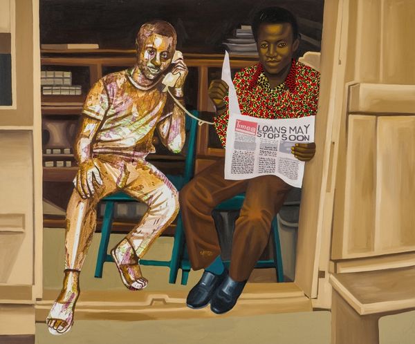 Cornelius Annor’s "Adanfo Pa" is a painting of two figures made with oil paint, and an incredible eye for tonal variation. There's something beautiful about the way Annor uses light and shadow to create form. The faces of the men are painted with such care, there is a real depth to the figures. Notice the patterns on the shirt of the man seated on the left, the way the eye is allowed to travel around the painting. There is a wonderful contrast with the flat floral surface of the wallpaper behind the figures. The way the painting is built up, layer upon layer, gives a sense of the artwork's own history, the labor and time involved in its making. This reminds me of Lynette Yiadom-Boakye, in the way that the figures seem so real, yet have emerged from the artist's imagination. It's like Annor is inviting us into a world that exists somewhere between memory and invention.