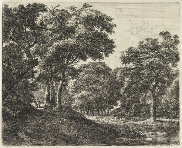 Anthonie Waterloo rendered this print, "Eendenjager," using etching. Notice the hunter in the foreground, a figure poised in action amidst nature’s dense embrace. The forest itself is a powerful symbol. Forests have historically been viewed as places of refuge, mystery, and danger. Here, the forest is a stage where human activity intersects with the wild. Think back to ancient myths. Forests were often the domain of gods and mythical creatures, testing grounds for heroes. We see echoes of the 'hunt' in earlier works. The hunt motif recurs across cultures, representing the struggle for survival, dominance, and sometimes spiritual pursuit. In each context, the hunter and the hunted play out a timeless drama, echoing through our collective memory. This cyclical progression of life, death, and rebirth engages viewers on a subconscious level.