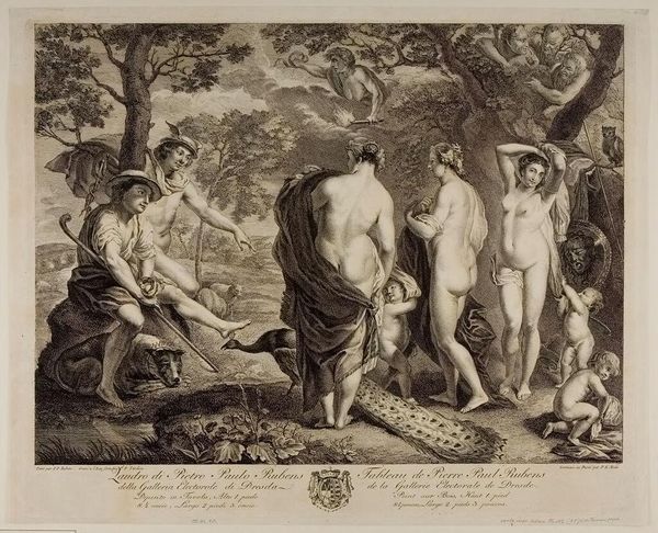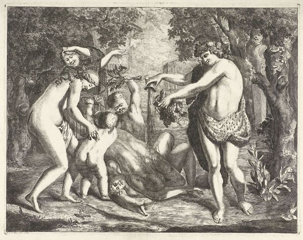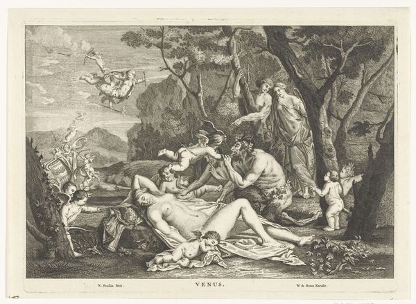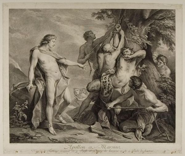 Curator: This print is titled "Good Samaritan," by Simon François Ravenet the Elder. Editor: It’s a stark image, the contrast really highlights the vulnerability and the raw humanity of the injured figure. Curator: Indeed. Ravenet, a skilled engraver, translated the narrative into a medium accessible to a wider audience through printmaking. How do you feel that impacts its message? Editor: It democratizes it, really. This rendering makes the biblical story less about divine intervention and more about immediate, practical aid. It challenges the viewer to consider their role in a society structured around inequality. Curator: I agree; by rendering it as a reproducible print, Ravenet ensured it would be consumed and interpreted by many different viewers in diverse social contexts. Editor: Precisely. It’s a call for compassion, delivered through the very means of production that often perpetuate social divisions. Curator: A compelling juxtaposition to consider. Editor: Absolutely, thank you for walking me through that.