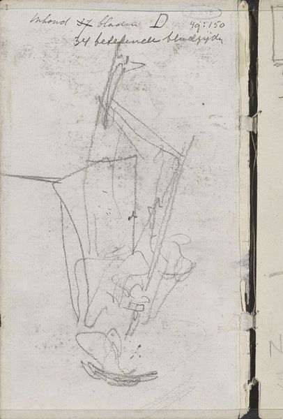 Editor: Here we have Isaac Israels's "Studie, mogelijk een figuurstudie," a pencil and graphite drawing, made sometime between 1875 and 1934. It's so ephemeral. The lines seem to barely graze the surface. I'm curious about what you make of this work. How do you interpret the near absence of the figure? Curator: Its incompleteness is potent. Consider the drawn figure not simply as absent but as *emergent*. Doesn't it invite a certain act of visual completion on our part? Editor: It does, now that you mention it! Like a Rorschach test. I'm filling in the details in my mind. Curator: Precisely! And what sort of figure takes shape as you fill in those details? A warrior, a saint, a ghost? Are these lines trying to evoke memory? Do you feel they have roots in classical sketches of heroes, perhaps deliberately stripped bare, rendered uncertain? The ladder-like marking near the top -- does that represent hierarchy, ascension... or an escape route? Editor: I see… so the symbolism could point to something about memory and transformation – a figure caught between different states of being? The figure's form, or lack thereof, seems very intentional, like Israels wants us to consider how we construct images in our minds and their inherent fragility. Curator: The fragility of the medium reinforces that too, doesn't it? What appears unfinished… is it, truly? Or is it a poignant commentary on our fleeting grasp on identity and representation itself? Perhaps Israels intended for us to actively co-create meaning, to project ourselves onto these lines, acknowledging that every figure, every identity, is a work in progress. Editor: This has given me so much to think about regarding how artists can invite us into the artistic process and cultural construction of an image. Thanks for shedding some light! Curator: My pleasure! And thank you for pointing out its powerful sense of absence, which has pushed my thinking as well.