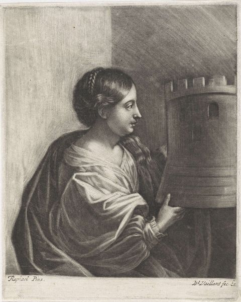 Editor: This is Wallerant Vaillant's "Saint Barbara," a monochrome print. She seems serene holding a tower. What do you see in it? Curator: I see a potent symbol of female resistance. Barbara, imprisoned for her faith, becomes an emblem of defiance against patriarchal structures. The tower isn't just a prison; it's a space of intellectual and spiritual growth, a challenge to imposed limitations. Editor: So, it is more than just the story of a saint? Curator: Absolutely. It's about how women historically carved out spaces of agency, transforming confinement into empowerment. It makes you wonder how we today can reinterpret symbols of constraint into catalysts for freedom. Editor: That's a powerful perspective. I'll definitely think about that.