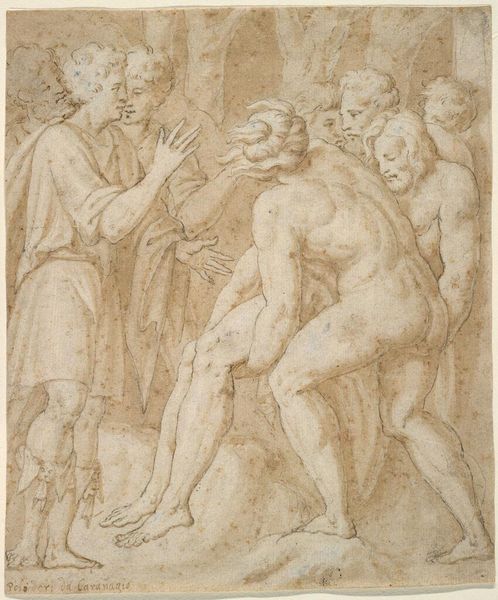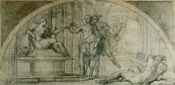 Curator: Here we have Michelangelo's Study for the "Colonna Pietà," dating from 1538. It’s rendered in charcoal on paper and housed here at the Isabella Stewart Gardner Museum. Editor: A powerful, stark composition strikes me immediately. The texture created with charcoal lends itself to a certain somber gravity, amplifying the sense of tragedy and loss in this rendition. Curator: Michelangelo really harnesses the visual language of Christianity, doesn’t he? Consider the pyramid shape. We have Mary at the apex, her arms raised in supplication, almost architecturally supporting not just the lifeless body of Christ but also a visual, iconographic plea to God. Editor: I appreciate your deconstruction, yet I question how literal that interpretation can be taken, Curator. I see instead an almost painful tension between Mary’s expression of anguish and the stark, muscular form of Christ; that interplay evokes a far more interesting symbolic dichotomy to me. There are layers beyond the explicitly Christian narrative, delving into profound human grief. Curator: Well, her pose does explicitly recall images of the orant, right? This conveys a very specific religious role. I think focusing on Michelangelo’s use of form in this specific iteration emphasizes the sheer emotional output, the expression is really very restrained yet immensely powerful and deeply felt. Editor: What I find compelling is the figures flanking the composition. Their forms, though providing physical support to Christ’s body, add another symbolic layer. There's a tenderness there, a humanity outside of just faith or mourning. The ambiguity of these elements opens the work up to broader interpretations, making it something more than a simple historical painting, elevating the emotion within the overall composition and narrative. Curator: The very fact we're still examining the potential design of this piece shows his capacity as a Renaissance artist to craft complex iconography. His forms and figures exist within this carefully constructed history. Editor: Precisely. And the ongoing cultural resonance surely resides in this artwork, this deeply emotional and exquisitely composed drawing.