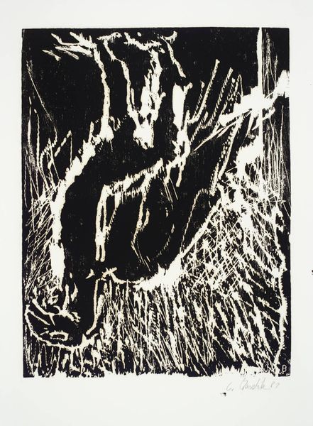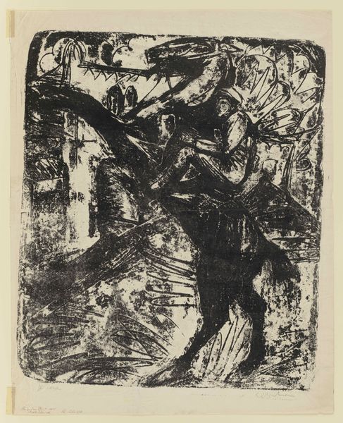 Editor: This is "Forest Road in Königstein with Mail Coach" by Ernst Ludwig Kirchner. It's hard to pin down a date for it. The scene feels so restless, like a fleeting memory. What stands out to you? Curator: The swirling lines certainly evoke a sense of unease and transience. Note how the coach is rendered almost ghostly. Kirchner often explored the psychological impact of modern life, and the mail coach here could symbolize a disconnect, a breakdown in communication, or perhaps even lost connections to the past. What do you make of the dense foliage? Editor: It feels claustrophobic, like the figures are trapped. I didn't expect to find that kind of emotional depth in a landscape! Curator: Exactly! Landscapes can often function as metaphors, reflecting inner states and cultural anxieties. Perhaps the artist is telling us more than we think about the society of that time. Editor: I see it now, the image carries so much more meaning. Thanks! Curator: A pleasure. Keep looking for those hidden stories in the visual world!