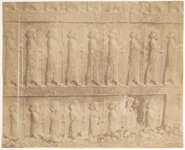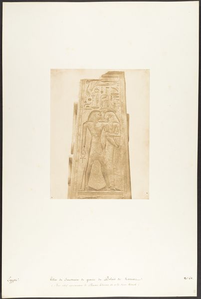 This photographic print, made by Maison Bonfils, captures a bas-relief of Ramses II, originating from Saqqara. The image, rendered in tones of sepia, reveals the material qualities of the original carving – likely limestone or sandstone. Consider the labor involved in both the original relief, painstakingly carved with hand tools, and the photographic reproduction. The Bonfils family were pioneers in the commercial photography of the Middle East. They were responding to a growing European market for images of exotic locales and ancient artifacts. The photograph flattens the three-dimensional depth of the relief. Yet it also democratizes access to it. Once, the relief was a monumental assertion of power, seen only by a select few. Now, through the reproducible medium of photography, its image circulates widely. This raises questions about authenticity, and the relationship between original artworks and their mass-produced representations, challenging our traditional understanding of art and its value.