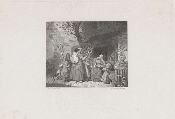 Editor: David Bles' "Interior with Soldier and Old Woman", created in 1844, is a beautiful pencil drawing. I’m struck by the contrast between the crisp details of the soldier’s uniform and the softer rendering of the old woman's face. What aspects of its composition or materiality stand out to you? Curator: It’s astute to notice the contrast in textures. Formally, I observe the use of chiaroscuro—the interplay of light and shadow—which imbues the scene with a sense of drama. Note the lines: short, precise strokes delineate the soldier, conveying a sense of rigid posture, while broader, blended marks soften the figure of the old woman, suggesting age and vulnerability. What of the interior architecture? Editor: I hadn't really noticed... well, the arched top suggests an almost stage-like space. It seems to focus all the attention on the figures. Does that make sense? Curator: Precisely. And consider the placement of objects within that space – the birdcage, the clock – and their relationship to the figures. The composition invites semiotic interpretation; each element carries potential meaning beyond its immediate appearance. Bles masterfully manipulates tone to create a hierarchy, guiding our eye and underscoring the figures' symbolic resonance. Editor: So, by carefully controlling the light and details, Bles creates not just a picture, but an entire world with symbolic meanings embedded in it? Curator: Precisely. The composition, through the use of light and materiality, evokes multiple layers. A true testament to drawing as a refined art. Editor: Thank you, I’m beginning to see how closely observing the visual components really unlocks a deeper meaning! Curator: Indeed. Keep looking, and the art will keep speaking.