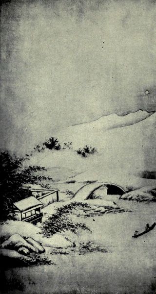 Curator: Hokusai’s “Fuji from the Sumida River” presents a bustling scene. The overall effect is one of dynamic movement, a flow of energy contained within a tightly constructed composition. Editor: Indeed, the visual language speaks of a journey, perhaps a pilgrimage. The mountain—Fuji itself—is subtly present, acting as a cultural touchstone more than a literal depiction. Curator: Note how Hokusai contrasts the sturdy, organic lines of the trees with the geometric rigidity of the rooftops. This creates a tension, a dialogue between nature and human intervention. Editor: And those umbrellas—they function as recurring motifs, each one sheltering an individual journeyer while also uniting them in purpose. It’s a delicate balance of individual and collective. Curator: The piece’s monochromatic palette further enhances its symbolic weight. The absence of color directs our attention to the underlying structure of the image, the way lines and forms interact. Editor: The image invites us to reflect on our own journeys, both physical and spiritual. A wonderful synthesis of form and cultural meaning. Curator: A testament to Hokusai’s ability to imbue the everyday with profound symbolism.