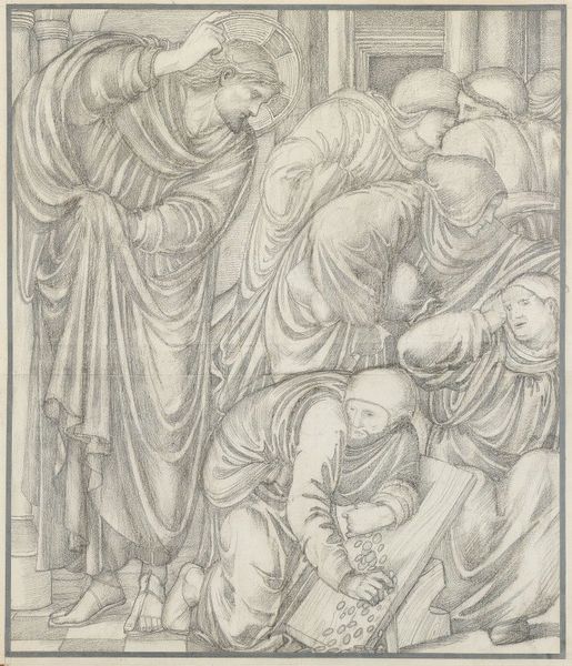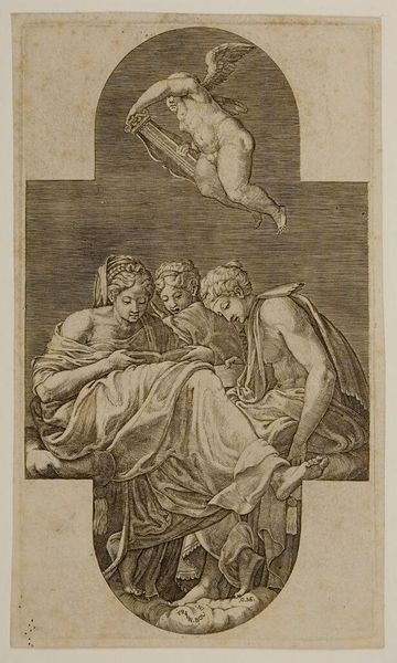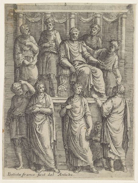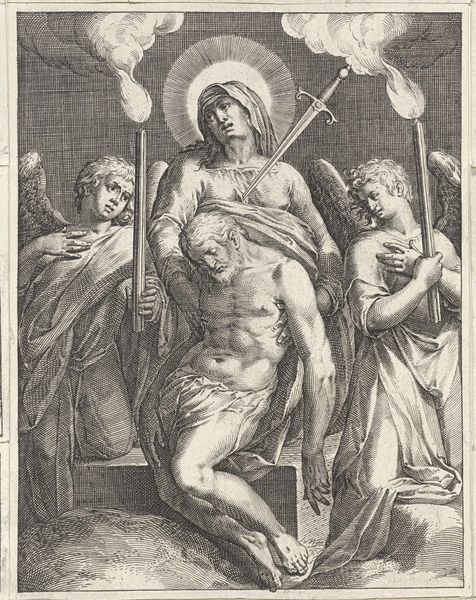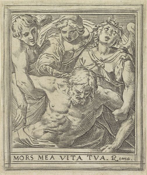 Curator: Immediately, I see somberness; it's all so meticulously rendered. The delicate lines seem to capture a quiet, almost sacred sorrow. Editor: Indeed. What we have here is “Kruisafneming”, or "Descent from the Cross", an engraving by Bartolomeo da Brescia, created in 1565, during the Italian Renaissance. Curator: An engraving—that explains the stark contrast, the precision of the line work. I’m drawn to the detail in Christ's musculature; it speaks of the labor and skill inherent in producing the print. The paper itself must have been carefully selected. What kind of production context are we considering for Brescia here? Editor: Let's consider this print as a commodity; its circulation enabled wider access to religious narratives and, importantly, helped disseminate artistic styles throughout Europe. But the image itself... it's a study in grief, isn't it? Note the Virgin Mary cradling Jesus, and the other figures each locked in their private lament. I see it as a reflection of communal suffering and empathy. The print allowed this display of emotions to reach a broad audience facing all kinds of different social issues at the time. Curator: Yes, but what about the craftsmanship that facilitates that reception? The way he models the figures, how the cross seems roughly hewn and weighty against the detailed figures—the textures alone must have taken weeks to execute. He wasn't just reproducing an image; he was transforming labor into meaning. Look how the light plays across the engravings - almost giving the image life beyond the moment that it depicts. The materiality allows for a kind of access to transcendence that a painted version maybe could not achieve at this time. Editor: The image is rife with contradictions, no? Intended for the masses, but steeped in an artistic language refined for an elite, educated viewership. What I find fascinating is how it blends accessibility with sophisticated compositional techniques; Brescia created an object accessible for devotion. It’s almost operating as propaganda in the wake of reformation ideas...it reinforces religious belief. Curator: An intriguing idea! This piece feels smaller than some of the iconic large oil paintings with similar thematics... but its portability certainly lends a powerful edge for the moment. I have newfound respect for Brescia's methods. Editor: It truly pushes us to question not just what we see but who it was made for, why, and with what means, thus broadening our cultural literacy around religion and Renaissance artistry. Thank you for adding so much nuance here today!