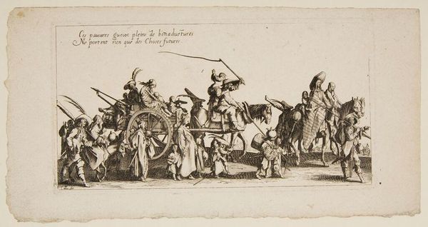 Jan Martszen de Jonge created this print, ‘The Entry of Maria de' Medici into Amsterdam in 1638’ using etching techniques. The composition is structured by a progression of horse riders, each meticulously rendered with fine lines to capture their regal attire and the dynamic movement of their steeds. De Jonge uses line and form to articulate depth, although the figures are closely packed to the foreground, limiting any real sense of perspective. The print's aesthetic lies in its detailed portrayal of status and ceremony. The linear precision gives a sense of controlled elegance, befitting the formal occasion. The choice of etching, with its capacity for intricate detail, serves to underscore the event's significance, transforming a political event into a structured display of power and artistry.