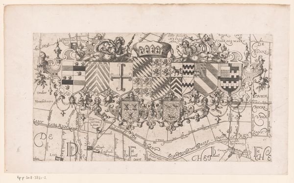 Curator: At first glance, it appears as an oddly calming pink landscape viewed through the finest screen. Like a heat map, only much, much older. Editor: Well, put your glasses on, because this isn't some hazy dreamscape. This engraving with watercolor, created sometime between 1689 and 1694, presents nothing less than "A Table of the Distances Between the Cities of Great Britain." Curator: Distances. Yes, a quite Baroque form of navigation—to render an otherwise straightforward chart so dense! It gives me a headache just looking at it, thinking about the poor traveler consulting this thing on horseback. Did they just get hopelessly lost from sheer information overload? Editor: It's all about materiality and production. Engraving allowed for the precise reproduction of this information, disseminated on paper, reaching merchants and administrators managing burgeoning trade networks. Think about the labor involved. Each mark meticulously etched, each wash of color painstakingly applied. Curator: Yet it feels as though there is some kind of tension present. All this obsessive order, a vain attempt to categorize an uncontainable world, so wonderfully absurd. Don't those floating hands with the golden squares suggest a sort of divine cartography? Editor: I think you’re onto something: standardization, accuracy – cornerstones of emerging capitalism. The symbolic significance is clear—to measure is to know and, perhaps, to control. This wasn't art for art's sake. It served a very practical purpose. Curator: Perhaps the beauty lies in its unintended poetics. Consider the act of traveling itself—a journey is less about the calculated distance and more about transformation, about becoming unmoored. That rosy haze of distance makes it more lovely than clinical. Editor: And yet we come back to the grid, that strict structure on which these early capitalist longings for both certainty and mastery are laid out. Seeing it laid bare like this offers more, and I am going to say it, "real" beauty than its flourishes of cherubs ever could. Curator: In a world increasingly obsessed with mapping and quantifying, maybe there's solace to be found in the lovely blur, in accepting the beautifully imprecise, shall we say? Editor: I concede the strange beauty of that old fashioned longing, but not the blur—but its clarity and ambition of measurement within its historical moment is most striking, at least to me.