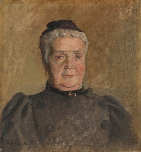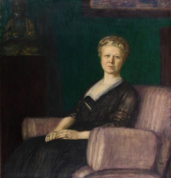 Curator: Here we have Dame Ethel Walker’s oil on canvas, "The Hon. Mrs. Adams," found in the Tate collections. Editor: Oh, she looks a bit formidable, doesn't she? But also, there's a quiet strength in her eyes, like she’s seen a thing or two. Curator: The figure dominates the canvas, doesn't it? We see her indoors, in her domestic space, a cat resting on her lap, perhaps symbolizing domesticity, comfort, the familiar. Editor: Cats are independent, so I wonder if the artist might have been suggesting something about her spirit as well, beyond the expected role. Curator: It is a lovely detail. I'm struck by the lace around her neck and cuffs, the rings on her fingers – these denote status, but also hint at the personal, the intimate. Editor: Yes, and there's a certain softness to the brushstrokes, which is interesting given the subject’s commanding presence. It almost feels like a gentle invitation into her world. Curator: I agree, it's as if Walker is saying, "Here is a woman of substance, seen not just through her social position, but through her own quiet dignity.” Editor: Absolutely, I think it’s a portrait that lingers in your mind, making you wonder about the life behind that gaze.