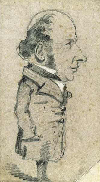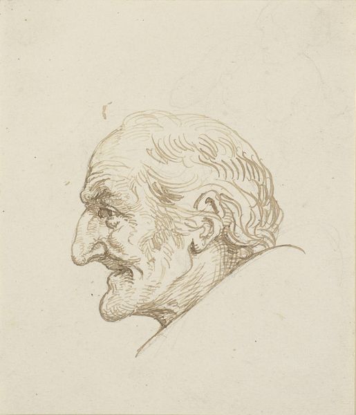 Editor: This small ink drawing is by an artist from the British School, its title is unknown. The man’s serious profile gives an air of formality, but the quick strokes feel more intimate. What can you tell me about the potential cultural context here? Curator: The sitter’s rigid profile and dress code indicate the social constraints and expectations of the time. How might we interpret this representation of masculinity in relation to power structures and societal norms? Editor: I suppose the focus on the profile flattens any unique characteristics into a commodity. Curator: Precisely. By analyzing such visual strategies, we unravel the complex negotiations between individual identity and societal power. Editor: That’s a great way to think about portraiture! Thanks! Curator: Indeed, art can tell a lot about how society works.
