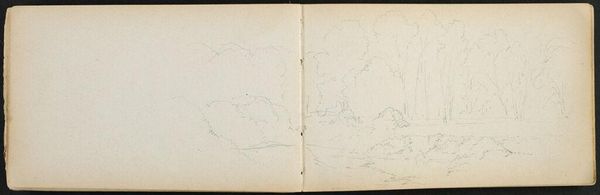 Curator: Here we have Sanford Robinson Gifford's "Landscape with Lake," a pencil sketch that provides a glimpse into his artistic process. Editor: It’s interesting. The muted tones and delicate lines create a sense of quiet introspection. There's a stillness that's quite captivating. Curator: Gifford, a prominent figure in the Hudson River School, often sketched outdoors. This sketch could be related to the rise of tourism and interest in nature as it became more accessible to city dwellers. Editor: I agree. The composition leads my eye gently across the lake to the mountains. The cabin nestled into the landscape adds a human element, grounding the vastness of nature. Curator: Right, the placement of the cabin and the inscription on the verso "Partial Ausable Pond Landscape with Cabin" suggests a desire to document specific locations as they were being "discovered" and appreciated for their picturesque qualities. Editor: Observing how the artist uses line weight to define form provides insight into Gifford's method of capturing the essence of this landscape, no? I wonder what other sketches were in this book? Curator: It’s all about connecting with nature at a time of rapid industrialization. His sketches tell us stories of that cultural shift. Editor: Indeed, there’s a thoughtful connection here. Let's move on.