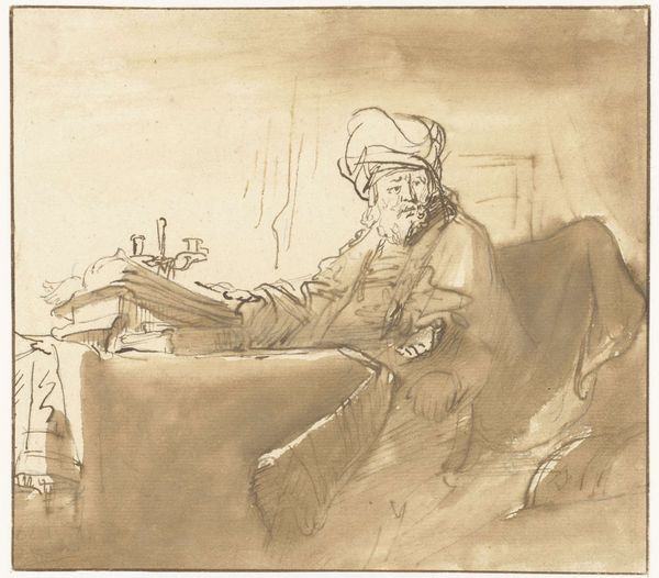 Editor: This is "Two Seated Old Men, One with a Globe," a pen and ink drawing by Willem Drost from around 1650 to 1655. The sketching is really loose and gestural. I'm particularly drawn to the details of the faces, especially their contemplative moods. What do you make of this work? Curator: Well, immediately I consider the historical context. Genre paintings like this gained traction as the Dutch Republic became more urbanized and the merchant class grew, shifting patronage. Before, religious or aristocratic depictions were common. Editor: So you're saying everyday people were starting to see themselves represented in art? Curator: Precisely. And think about the globe itself – a powerful symbol of knowledge, exploration, and commerce. Does the act of contemplating the globe suggest the vast world is available to them or instead does the confined indoor space and old age hint at its inaccessibility? What statements are being made, then, about access to information? Also, who controlled these representations and narratives at that time? Editor: It's fascinating how the globe could mean such different things depending on your point of view. So the image isn't just a neutral observation of everyday life, but rather, it can reveal something about societal values and even who has access to global trade and intellectual spheres? Curator: Exactly. We have to look at who is being portrayed, where the work would have been displayed, and what power structures might be subtly reinforced or challenged. Think about its purpose. Was it didactic? Commemorative? Satirical? Editor: I'm definitely seeing more depth in this seemingly simple scene now. It is a small glimpse into how the wealthy class viewed trade. Thank you. Curator: It encourages us to be critical viewers, recognizing how art always exists within broader social and political currents.