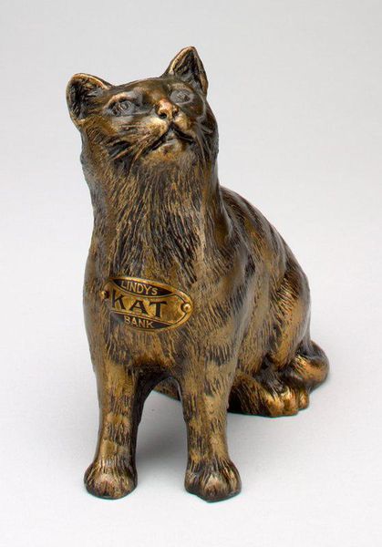 Editor: So this is *Seated Cat with Soft Hair - still bank*, made by the Arcade Manufacturing Company sometime in the 1910s or 20s. It’s a small sculpture, made of metal. I find the expression kind of charming, yet a bit unsettling. What can you tell me about this work? Curator: I see this piece not just as decorative art, but as a reflection of the socio-economic landscape of early 20th-century America. Mass-produced items like this bank democratized art and design, bringing them into everyday homes. Think about the changing roles of women during that era—were these savings banks aimed at children or perhaps women gaining more control over household finances? Editor: That's a perspective I hadn’t considered. I was just seeing a kitschy cat figurine. Curator: And that's a valid reaction. But consider also the "folk-art" tag; how does this mass-produced object relate to handcrafted folk traditions? Is it an appropriation, a continuation, or something else entirely? Perhaps a commentary on class. What do you make of the phrase 'soft hair'? Is that perhaps playing with stereotypes of class? Editor: Hmm, the ‘soft hair’ is interesting. I can see what you’re getting at regarding gender and class now – it makes me look at it very differently. Maybe the folksy form disguises more pointed commentary on money and societal roles? Curator: Precisely. Art, even seemingly simple decorative objects, can be powerful cultural documents if we examine their contexts and subtexts. Editor: I guess I need to work on viewing art through a critical lens, looking for those layers. Thanks!