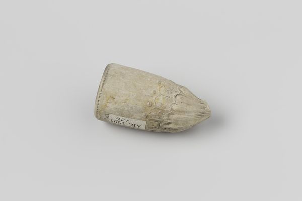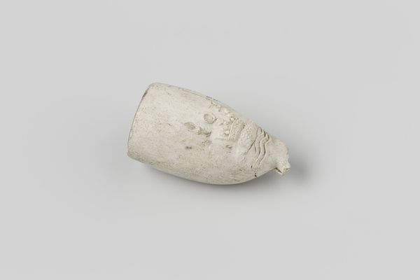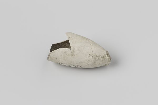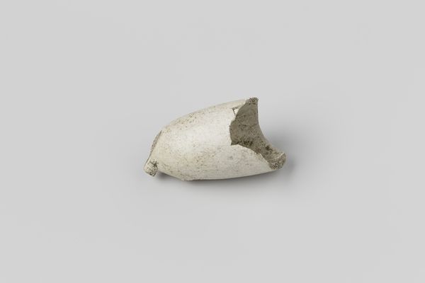 Editor: This is an earthenware fragment of a baroque pipe bowl, dating back to sometime between 1750 and 1780. I'm struck by how simple it is, yet the remnants of decoration hint at a more elaborate whole. What draws your eye to this fragment? Curator: Note how the bulbous form is contained by implied lines, the subtle relief creating pockets of light and shadow across the object. This interplay manipulates the viewer's perception of depth on what is, essentially, a small, contained surface. Observe the material, earthenware, typically associated with more utilitarian objects. What purpose might this have served in the context of 18th century society? Editor: I hadn't considered the contrast between the refined lines and the common material. Was the appeal purely aesthetic? Curator: Aesthetics play a key role. Baroque art favored elaborate details. Consider this object's semiotic weight – what statements were being made by crafting something mundane from such detail and care? Editor: So it is elevated because of the form despite the base material used? Curator: Precisely. By focusing solely on form and material, we gain a nuanced appreciation that transcends mere historical context. What does it say to you now, without concern for context? Editor: That even in a fragment, the artist's intention still conveys a message about artistry. Curator: A successful piece speaks through its structure, irrespective of origin. Editor: Thank you, this approach reframes my appreciation of objects such as these!