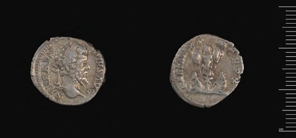 Curator: Here we have a denarius of Septimius Severus, currently residing in the Harvard Art Museums. Editor: It looks so small and worn, yet it conveys a sense of immense power. Curator: As a form of currency, its materiality speaks volumes about the Roman economy and imperial power. The silver content, its weight of just over two grams, and its circulation all reflect economic stability and trade routes. Editor: But beyond that, the image of Septimius Severus, the wreath, and the seated figure on the reverse – these are carefully chosen symbols meant to project authority and divine favor. Curator: Absolutely. The die striking process itself, the skill of the minters, all contributed to the standardization of Roman currency and the dissemination of propaganda. Editor: It’s a fascinating artifact, a tiny object carrying so much cultural weight. Curator: Indeed. It's a prime example of how something seemingly simple can reveal complex systems of power and production.