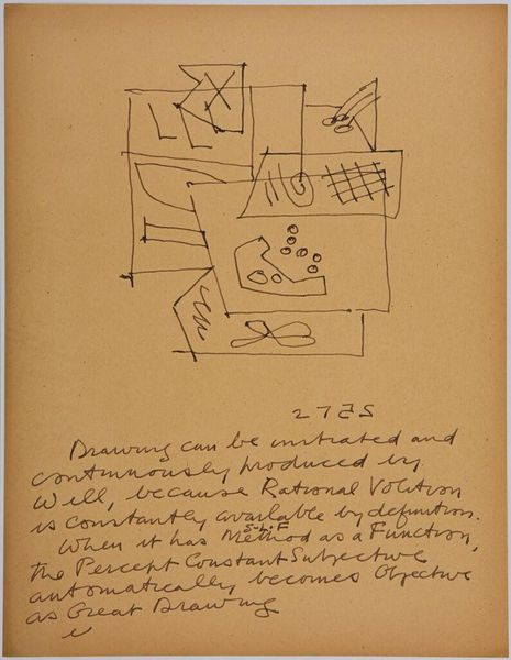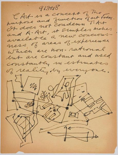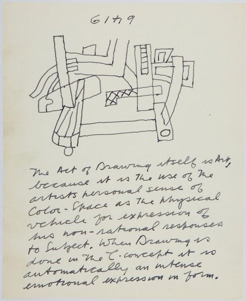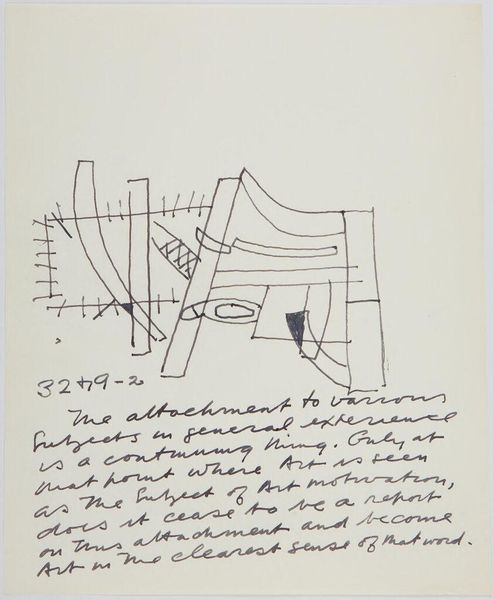 Editor: Here we have Stuart Davis's preparatory sketch, "Study for 'Theme for 'Eye Level'". The linear quality and handwritten annotations are quite striking. What do you make of the artist’s exploration of form and line in this piece? Curator: The beauty lies in the reduction to pure form. Davis presents a structural analysis, stripping away representational concerns to explore the relationship between line, shape, and the spatial dynamics they create. Note how the lines interact—do they suggest a tension or a harmony? Editor: I see tension in the conflicting angles, but the frame provides a sense of order. I hadn't considered the spatial dynamics so explicitly. Curator: Precisely. The composition is not merely decorative; it is an investigation into the fundamental visual language. This piece highlights the intrinsic qualities of art itself. Editor: So it's less about what it depicts and more about how it's constructed? I understand now. Thanks.