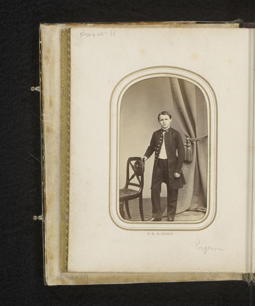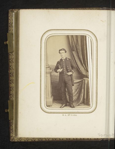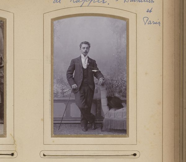Curator: This is a gelatin-silver print titled "Portret van een jongeman," attributed to Antoine Lumière and created sometime between 1871 and 1900. What impressions does it stir in you? Editor: Oh, he looks like someone just told him his bicycle got a flat tire. So earnest! The light's making that draped backdrop almost liquid, and the formality with the pocket watch screams middle class respectability. Curator: Indeed. Note how Lumière adheres to a realist style; his meticulous attention to sartorial details speaks volumes about the sitter's status, but observe also how he employs photographic techniques to manage light and shadow. There’s a carefully constructed tension. Editor: Yeah, he's caught between wanting to project confidence but just radiates youthful vulnerability. His stance isn't quite relaxed. More like politely enduring the photoshoot. Almost like he’s a character in some unwritten melodrama, perpetually caught between his aspirations and…well, bicycle tires. Curator: An astute observation. Consider the compositional choices too—the off-center placement creates an unsettling dynamic and draws our eye across the photographic plane. The artist almost plays with visual expectations to enhance meaning. Editor: It's strange, seeing this staged moment of so much restraint next to this spontaneity. But maybe that's the point, right? Trapped in formal poses and all those stifling norms. Curator: Quite. It’s also striking that the muted tonality underscores this restraint; everything seems subdued, emphasizing emotional subtleties through technical proficiency. Editor: There’s something endearing about it. A little awkward, definitely, but full of stories beneath that composed surface. It’s a very…human picture. It’s also kind of hilarious. But, don't tell him that! Curator: Absolutely. And what appears technically precise here, yields rich symbolic narratives. A glimpse into the social theatre of its era, wouldn't you say? Editor: It's hard not to like someone immortalized like that, you know? It really encapsulates life between those dates: 1871 and 1900. Curator: The subtleties are as intriguing as its overt features; a fine study in contrasts. Thank you for those imaginative connections. Editor: Anytime. Maybe, next time, someone will just give him that bicycle.