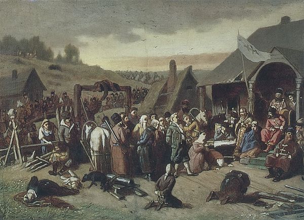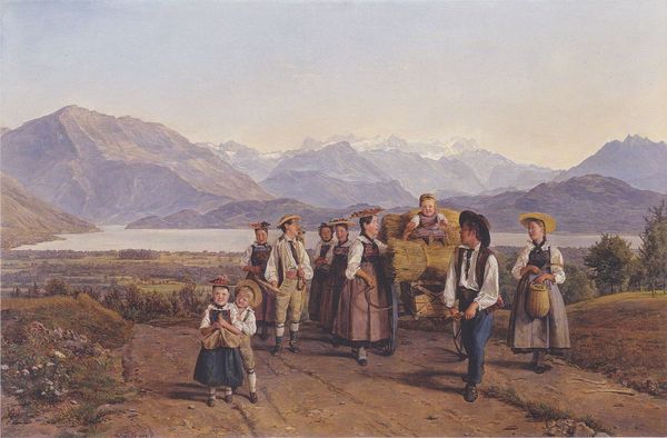 Curator: Let's spend some time with Ivan Mrkvička's "Zadushnitsa" from 1890. It’s an oil painting capturing a very specific cultural tradition. Editor: My first impression is how poignant it is. There's a somber yet somehow communal atmosphere radiating from the canvas. The scale feels significant too, almost like a staged tableau vivant. Curator: Indeed. The title, "Zadushnitsa," refers to a day of remembrance for the dead in Eastern Orthodox traditions. Mrkvička painted this scene depicting precisely that, highlighting both the public performance of grief and private moments of mourning within the community. You can really see that duality present. Editor: Absolutely. Looking at the materials—the oil paint itself—the artist masterfully uses it to differentiate textures: the rough-hewn stone of the crosses, the softer fabrics of the mourners’ clothes, and even the varied surfaces of the offerings they've brought. All are rendered with attention. It raises questions about labor too—who produced these materials, both the art supplies and the grave goods? Curator: And how such customs are perpetuated. It is also fascinating to consider Mrkvička's own position within this social landscape. A Czech painter portraying a South Slavic custom, navigating his own identity within the Austro-Hungarian Empire…it speaks volumes about the flow of cultural exchange and the gaze inherent in representation. The artistic academy very much expected this type of work. Editor: It is all there, in plain sight, or not so plain. Consider those crosses. The carvings have a very tangible quality. And what is offered? Small goods, small gestures accumulated, massed for one to remember a loss, the process itself the means and not the painting. It’s fascinating how the artistic traditions of Realism merge with deeply rooted social practices to commemorate and perhaps subtly critique. Curator: Mrkvička gives us access to reflect on how communities process mortality collectively, on public expressions of grief, and of course what informs that. It brings us face to face with ourselves in many ways. Editor: Exactly. Thinking about this painting in terms of production and consumption changes how one views the scene presented before us. It makes one stop to think about every component's purpose and material worth as one moves through this work of art.