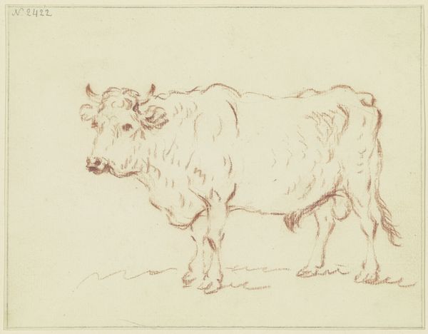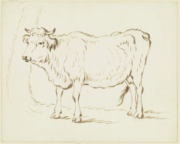 Curator: We’re standing in front of "Lying Cattle to the Right", an ink drawing currently held at the Städel Museum. Its creator is Friedrich Wilhelm Hirt. Editor: It’s surprisingly soothing, isn't it? All soft lines and earth tones. Like a fuzzy, slightly judgemental, cloud just parked itself on the page. Curator: Indeed. Hirt, through his art, was subtly engaging with early Realism. He meticulously depicted the details and textures of the animal, seemingly aiming for objective accuracy. Yet his realism arguably becomes imbued with genre-painting tropes by selecting such a common subject, which invites us to ponder social, agricultural, and gendered dynamics of land use at that time. Editor: I can almost feel the warmth radiating from that beast. It feels grounded, unbothered. Like, “Yeah, I'm a cow, what’s it to ya?” I almost want to scratch behind its ears! Do you think Hirt had a particular bovine in mind when he made this? Curator: One imagines Hirt, influenced by philosophies of naturalism, meticulously studied the rural labor of the animal, so he may very well have had a bovine muse! Its positioning dominates our perception and it might serve to critique the social structures reflected in its humble everydayness. Editor: It's almost meditative to study how he captured its bulk with such minimal lines. I feel it encapsulates something profoundly simple. How, when looking at it now, one sees commentaries on labor or genre. I mainly feel an overwhelming desire for a nap under a big tree. Curator: I appreciate how you observe it, with its seeming emphasis on quiet dignity of life and pastoral scenes. The drawing prompts critical reflections on intersecting histories and the representation of often-overlooked actors within society, I think. Editor: I like our interpretations a lot. Thanks, let’s go get ice cream. Curator: Agreed!