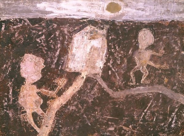 Editor: So here we have Rufino Tamayo's "Mujeres en reposo," made with oil paint, though its date is currently unknown. What I immediately notice is the muted, almost earth-toned palette. The figures seem integrated into the landscape. It makes me wonder about the intended connection between women and the natural world in this painting. What’s your perspective on that, and what other societal factors might be informing Tamayo's portrayal here? Curator: It's astute to notice how Tamayo blurs the boundaries between figure and landscape. In the context of Mexican modernism, and the post-revolutionary period especially, artists were tasked with creating a new visual language. Consider Diego Rivera's emphasis on labor and indigenous identity within a socialist framework, versus Tamayo, who often takes a more psychological approach to these themes. How does this quiet scene of repose differ from those earlier, more assertive depictions of Mexican identity? Editor: I see your point about the divergence from overtly political works. I suppose, in that sense, choosing a universal theme like rest allows for broader cultural connections beyond just the immediate revolutionary moment. Yet, by presenting this quiet intimacy, isn't he still commenting on women's roles or perhaps offering a counter-narrative to their frequent depiction as symbols of national strength? Curator: Exactly! The "resting women" resist a purely nationalistic reading. We must consider not just *what* is shown, but *how* it's presented. What social messages are transmitted by this apparent idyll of domesticity, or alternatively by setting female figures in landscapes that feel less national and more universal. How are societal power dynamics embedded even within seemingly simple depictions of relaxation? Editor: I hadn't really considered the role of ‘rest’ as a deliberate statement. That changes the way I view it! Thanks, this makes me rethink my first assumptions about it only being a pleasant landscape. Curator: That’s the value of examining art in its broader historical and social contexts. We see that even quiet scenes can resonate with deeper socio-political meaning.