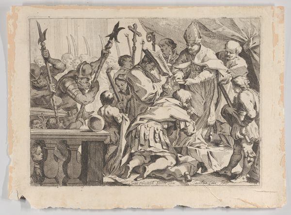 Rombout van Troyen created this drawing, Calvary, to depict the crucifixion of Christ. See how the cross, though central, is not yet upright. Instead, it's being hauled and pushed, a symbol of burdened humanity. The figures strain, their muscular bodies reminiscent of classical sculptures, yet their task is imbued with Christian symbolism. Consider the serpent-entwined staff—an ancient symbol, it appears in varied contexts, from Hermes's caduceus to the Rod of Asclepius, representing healing and knowledge. Here, it gains a twisted irony. The serpent, traditionally a symbol of wisdom and medicine, is now juxtaposed with the ultimate sacrifice of Christ, highlighting a moment of profound change and suffering. The image conveys a primal emotional force, a collective memory of pain. The act of bearing a heavy load—a cross, in this instance—reverberates through history. The figure, bent and strained, recurs in various forms: Atlas bearing the world, or laborers in ancient Egyptian friezes. The symbol is cyclical, resurfacing and evolving, reminding us of the continuous threads of human experience woven through time.