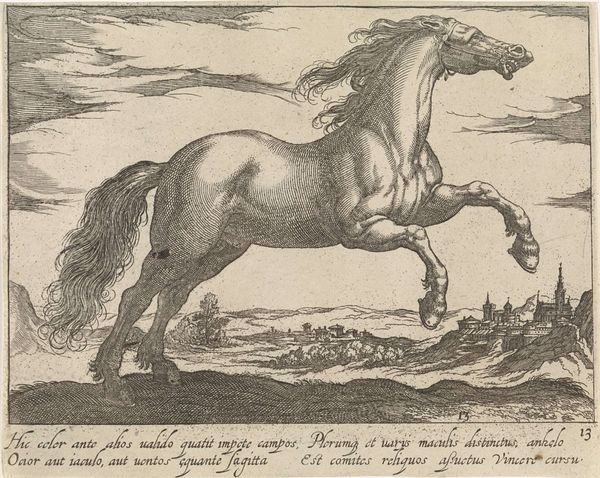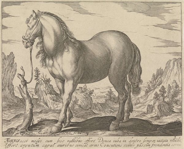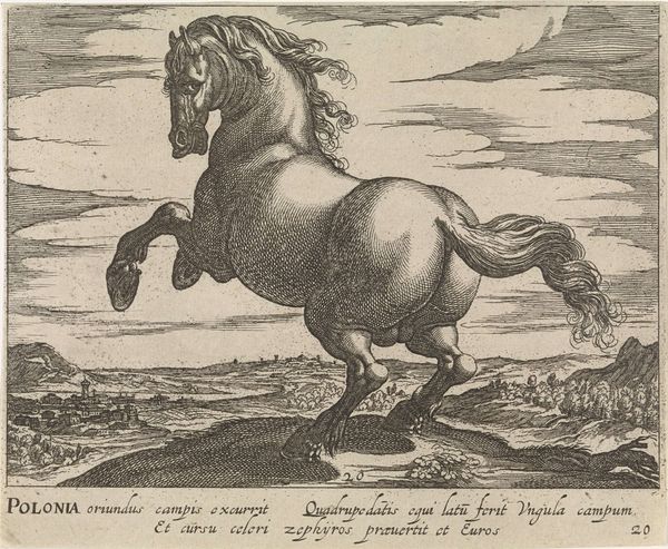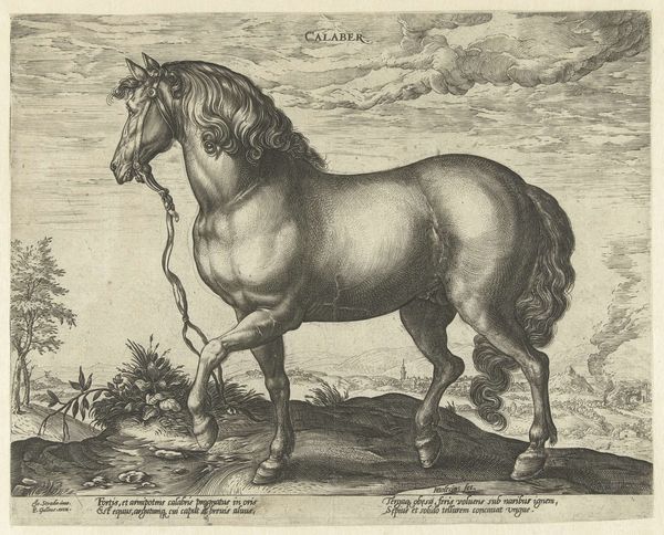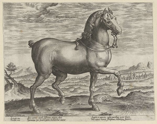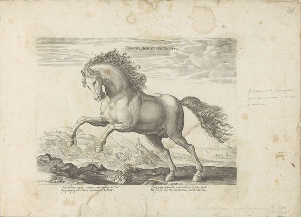 Curator: This etching, “Wild Paard” by Hendrick Goltzius, created between 1577 and 1581, immediately strikes me. The energy in the horse is palpable, even rendered through such precise lines. Editor: It's quite something. The detail, particularly in the horse's mane and the landscape behind it, is incredible. It’s at the Rijksmuseum now. As you say, I find myself so curious about the technique, but I am struggling to know more, What do you see in this piece? Curator: For me, it’s the engraving process itself that speaks volumes. Think about the labour involved in creating these lines, each etched with intent. The materiality of the copper plate, the pressure of the burin—all of these aspects contributed to the final image. Editor: I see... so, beyond just the depiction of the horse, you’re focusing on the physical act of making the artwork itself. Does that change your interpretation? Curator: Absolutely. Goltzius was not merely representing a horse; he was also showcasing his mastery over the medium. The print becomes an object of skillful labour, reflecting the values of the artist and the society he was a part of. This skilled production catered to a growing market for prints, consumed by wealthy collectors. Do you see a relationship between the horse as a status symbol and printmaking's affordability for a wider audience? Editor: I hadn’t thought about it that way, but now that you mention it, yes! The print allows wider access to that symbol of power. Curator: Exactly! It challenges traditional art history’s focus on singular, unique works. It’s not just about high art but considering how skilled artisanship and its product, the print, circulates. Editor: This makes me look at the art-making and artistry in an unexpected new way! Curator: Precisely. This new look should reveal an underlying discourse of labour and commerce, shifting away from the traditional narrative centered on aesthetics.