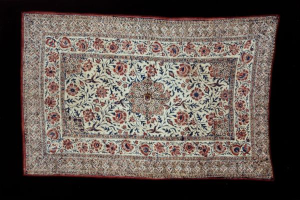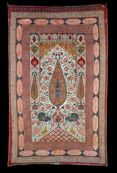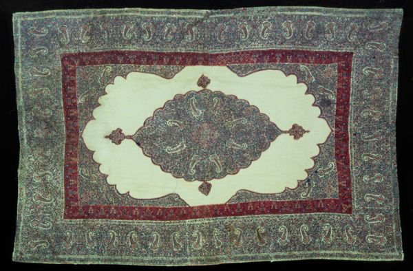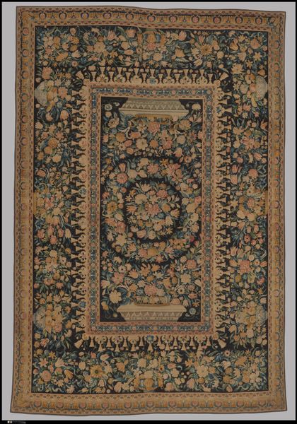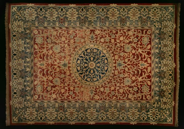 Curator: This striking textile is the Holland Park carpet, created between 1885 and 1899 by the renowned British artist William Morris. It’s now held in the collection of the Metropolitan Museum of Art. Editor: Immediately, the density strikes me. The color palette is muted—a dusky blue overlaid with earthy reds and tans—but the pattern itself is incredibly rich and intricate. It’s almost overwhelming at first glance. Curator: Morris was deeply inspired by the natural world. The flowers and foliage aren’t literal depictions, but they evoke an idealized, abundant landscape. You see the influences of the Arts and Crafts movement very strongly here, don’t you? Editor: Absolutely. There is a clear visual structure present as well, a very formal mirroring in the central register that creates this powerful symmetrical arrangement with the central blossoms at top and center. It offers visual balance in what might otherwise devolve into chaotic naturalism. Curator: These stylized botanical forms, recurring across centuries in decorative art, resonate with ideas of renewal, growth, and the beauty of the earthly realm, what's more is the contrast and relationship with our human experience with nature. Morris’s designs frequently carried implicit social commentary, championing craftsmanship against industrialization. Do you see that embedded here? Editor: The visual texture implies an attention to detail at scale that gestures against the grain of machine made textiles of the era. The tension is balanced though as, in other formal structures of visual art and textile, the implied depth through layered design elements lends itself to both flat pattern-making but also dynamic three-dimensionality. It’s very complex, indeed. Curator: Morris saw beauty as intrinsically linked to social well-being. His designs weren’t merely aesthetic, but also meant to promote a healthier relationship with the built environment. Editor: I agree; engaging with such complexity asks viewers to stop and unravel—it cultivates active looking in an environment of increasingly passive seeing. Curator: Looking closer and through that historical lens really reveals how this artifact reflects long standing and modern anxieties. Editor: I appreciate you connecting the design to historical themes. Analyzing pattern this way can often unearth so much, just beneath the surface of appealing art objects.