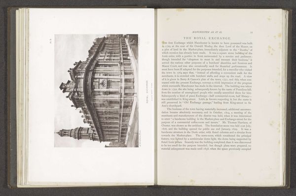 Editor: Here we have "Gezicht op de Royal Exchange in Manchester," a photograph by Alfred Brothers, dating from before 1878. It’s an albumen print in an album. I’m struck by the starkness of the building; it almost seems to loom. What do you see in this piece? Curator: What immediately captures my attention is how this image documents the industrial revolution’s impact through the materiality of this new financial center. Consider the physical labor involved in constructing the Exchange itself and in producing the photographic print. What raw materials were extracted and transformed? What kind of working conditions made that possible? Editor: So, it’s less about the aesthetics of the building itself, and more about what the photo represents? Curator: Precisely! Think about the very act of creating an albumen print. Egg whites were used to coat the paper, a rather laborious and delicate process. It wasn’t mass reproducible like photography is today. It raises the question: who had access to such a process? What social class are we seeing represented here through both labor and luxury? Editor: That’s a fascinating angle. I hadn’t thought about the production process as a reflection of societal structures at the time. Curator: And beyond the photograph, what function did the Royal Exchange serve? How did it facilitate and regulate the flow of capital, and what were the social consequences of this activity in Manchester? How were the labor practices inside related to practices on the outside? Editor: It’s interesting to see the architecture, the photography, and the economics all intertwined. Curator: Yes, this photograph isn't just a document of a building, but a testament to a particular moment in industrial history and a complex system of labor and materiality. We can discuss how consumption impacts labor, going far beyond this image alone. Editor: I learned a lot about viewing the context that informed it, rather than the image itself.