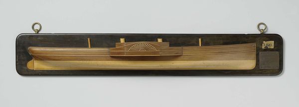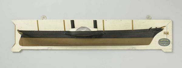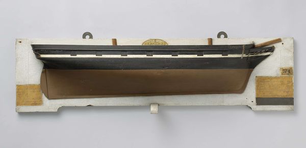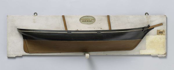 Curator: We're looking at a "Half Model of a Floating Battery," crafted in 1867 by Rijkswerf Vlissingen. The term 'half model' refers to the practice of creating just one half of the vessel, presuming symmetry about the center line, as can be seen. Editor: There’s a starkness to it. It feels quite austere, doesn’t it? Minimal detailing; an almost brutal reduction of form down to its essence, affixed onto what appears to be a painted wooden board. I wonder about the materiality and how that communicates power or intention. Curator: Indeed, that austerity serves a particular function. The emphasis is on clear lines and volume. These were tools for naval architects and shipwrights. Note the sharp, efficient geometry—the acute angles of the battery protecting its lower half from incoming fire, juxtaposed with the curved lines which define its naval capabilities. Editor: Absolutely. It begs the question, what was the labor involved in constructing this model and the ship it represents? Think about the procurement of materials, the social relations inherent in a massive undertaking like shipbuilding for colonial and trade efforts. I imagine countless hours from skilled and perhaps unskilled labor, organized in such a way that it often goes unseen and underappreciated. Curator: But we cannot discount the formal choices within that context. The symmetry speaks to the ideal, a pursuit of perfect equilibrium on water and, by extension, dominance at sea. The smooth surfaces almost completely remove texture which speaks of efficiency and an ability to reduce any potential friction. The object stands alone. Editor: Though, let's remember, a solitary object is rarely ever solitary in its making or its implications. Even here, we might reflect on the absence, say, of an aesthetic appreciation of wood, that has seemingly been obscured by a coating to almost render its presence unseen. The intent seems to have it fade into the background rather than celebrating the material it is resting upon, no? Curator: A keen observation. Perhaps an acknowledgement that the backdrop itself—support for the battery, should in essence ‘support’ it. In the same way it sits supporting it in real life. In this rendering of the potential design is the suggestion of an inherent ability to execute a very clear practical functionality above and beyond aesthetic delight. Editor: Which raises profound questions, doesn’t it? What are the social implications when industrial and state processes attempt to ignore and devalue materiality itself? Curator: A question worthy of extended reflection. I believe a thorough visual analysis will reveal that a more thoughtful application of materials reveals an elevated attention to function and, ironically, longevity. Editor: Indeed, something easily overlooked in favour of perceived gains.