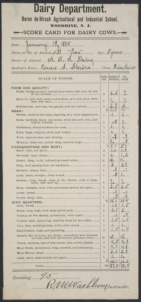 Curator: At first glance, this document seems like a simple form, but it opens a window into a fascinating history. It's a dairy report made by Marcus Smulyan at the Baron de Hirsch Agricultural and Industrial School in Woodbine, New Jersey, dated January 22, 1904. Editor: The handwritten script gives it an intimate feel, like a personal record of daily life. The columns and figures—temperature, fat content—it feels almost like an attempt to bring order to the natural world. Curator: Indeed. This school was part of a larger effort to integrate Jewish immigrants into American society through agricultural training. The dairy, and this report, are symbolic of that transition, of rooting oneself in a new land. Editor: So, the meticulous record-keeping reflects a cultural value—perhaps a desire for control in an unfamiliar environment, or even a testament to the potential for renewal. Curator: Precisely. Smulyan's report, beyond just data, becomes a symbol of resilience and adaptation. The separator work, converting milk to cream, is transformative. Editor: Seeing the form presented this way really shifts my understanding of it. It’s about more than just milk; it's about transformation, community, and the making of a new home.