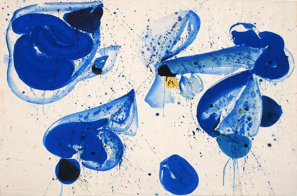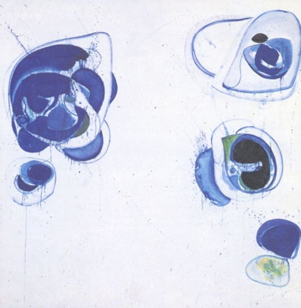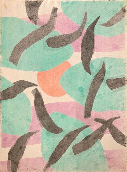 Curator: Let's turn our attention to Koloman Moser’s "Animal motif for a picture book," created around 1904. The artwork is watercolor on paper and presents an image reminiscent of decorative art. Editor: My initial response is whimsy. The scale is intimate, almost jewel-like. The texture created by the watercolor washes adds an ethereal quality. Curator: Precisely. Notice how Moser uses color and shape. The red of the birds pops against the darker ground. The forms are simplified, almost abstract, highlighting their essential nature. The eye is drawn to the circular pattern created by the bird’s body, and also the surrounding orbs within the dark space around the figures. Editor: I see two red birds, stylized and round, each gazing outwards with innocent curiosity. Birds have such a long history as symbolic messengers; here, they seem poised on the brink of speech. Their vibrant redness contrasts with the almost cosmic swirl behind them. This makes me wonder about the connection between the earthly and the ethereal. The violet and white shapes surrounding the two figures lend the dark wash depth. Curator: The context here is important. Moser was a key figure in the Vienna Secession, which embraced experimentation and challenged academic conventions. The flattening of perspective and the emphasis on decorative elements place it firmly within the Art Nouveau aesthetic. Editor: Yes, the symbolism of Art Nouveau. I am looking closely and wonder what is represented by that swirling green shape with stars. To me, it resembles the concept of nature, or even an artificial representation of heaven. This image of birds set against this backdrop does echo some longings, perhaps for peace, hope or the beautiful things which are possible for humanity to achieve. Curator: Interesting, that interpretation is a departure from my original perspective of the work. Editor: What are your thoughts regarding Moser's choice of using watercolors? Does the fragility speak to the ephemeral nature of the artwork? Curator: Without a doubt. It's almost a commentary on transience, rendered with such delicate grace and control of shape. And his implementation offers an emotional depth rarely encountered. Editor: Well, considering its subtle composition and careful symbolism, perhaps what strikes me most about Moser's small artwork, “Animal motif for a picture book,” is its quiet call to embrace our humanity in an indifferent cosmos.