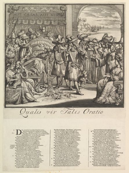 Romeyn de Hooghe created “L'Europe Allarmée” as an etching on a sheet of paper. The immediate visual impact arises from the dynamic composition, crowded with figures under an arched structure, all rendered in meticulous detail. This gives it a bustling, theatrical feel. De Hooghe masterfully employs line to define forms and create texture. The dense network of lines generates a sense of depth and movement, drawing the eye across the composition. Semiotically, the gathering of richly dressed figures can be interpreted as a signifier of power and political intrigue, reflecting the complex diplomatic landscape of Europe at the time. The crowded space destabilizes any sense of clear hierarchy, suggesting a world where traditional power structures are in flux. The artist challenges fixed meanings by presenting a scene ripe with narrative potential, inviting viewers to decode the underlying social and political commentary. The formal quality of density, both in line and composition, serves as a mirror to the complex and often chaotic nature of European politics.