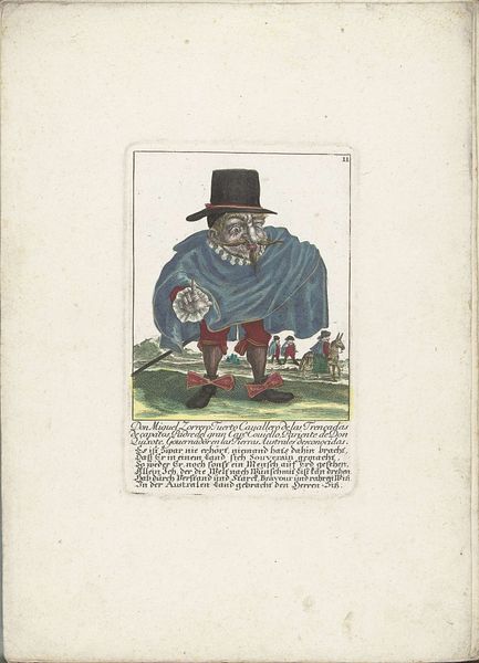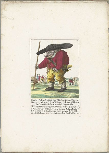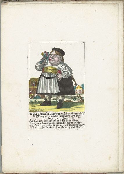 This print of Veith Knollinger, a dwarf, dates from around 1710 and was made by Martin Engelbrecht. It's an engraving, meaning the image was incised into a metal plate, likely copper, and then printed with ink. The real artistry lies in the skilled handwork required to create such detailed lines and textures. Notice how the engraver uses varied line weights to give form to Veith's clothing and facial features. The subtle cross-hatching creates shading and depth. The application of color is also a hand process. Each print would have been individually painted. This combination of mechanical reproduction and hand finishing is key. The printmaking industry allowed images to circulate widely, catering to a growing market for affordable art. But it also relied on the expertise and labor of skilled artisans, caught between industrialization and craft traditions. These prints offer a fascinating glimpse into the visual culture of the time and the complex relationship between art, labor, and commerce.