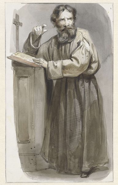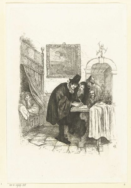 Editor: This is "The Monk" by Sir Richard Rivington Holmes, held at the Tate. It's a small print, quite detailed. The subject matter feels very contained and still. What compositional elements stand out to you? Curator: Indeed, the deliberate orchestration of line and light is remarkable. Observe how Holmes employs hatching and cross-hatching to delineate form and texture. The composition is structured by a play of orthogonals, creating a sense of depth within a confined space. How does this interplay contribute to the overall mood? Editor: It feels very focused, almost claustrophobic. I see now how the lines add to that sense of enclosure. Thanks for your perspective! Curator: My pleasure, reflecting on the artist's choices is always worthwhile.