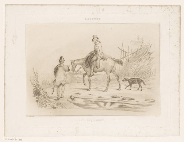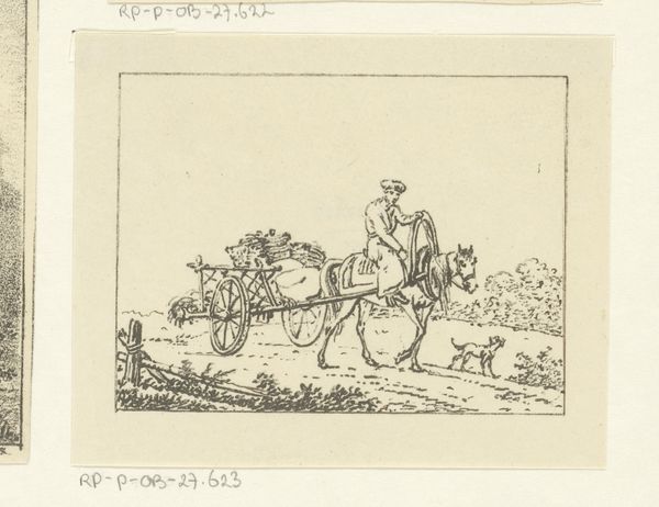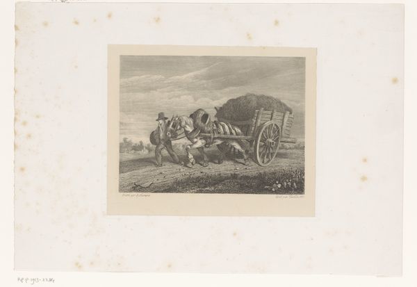 Curator: This artwork is entitled "Chariot Race (?)," an etching of unknown date by François Jules Collignon, found within the collections of the Harvard Art Museums. Editor: It has this playful, almost satirical air about it. The chaotic energy of the donkey pulling that cart is beautifully captured. Curator: The rough, etched lines really emphasize the donkey's strained musculature, drawing attention to its labor, doesn't it? The artist really makes us think about the physical process of pulling that cart and the people within. Editor: And that whip! It's not just about forcing movement, but perhaps domination, the societal power structures are represented here. The symbols are everywhere if you start looking. Curator: Indeed. I find myself contemplating how the economics of printmaking democratized art, making such satirical pieces accessible to a wider audience. Editor: Seeing the image with that context makes it even more meaningful. Curator: Absolutely. It's a small piece, but it raises big questions about how art reflects the societies that produce it. Editor: Agreed. It leaves you with a lot to ponder about cultural memory, even in its humor.