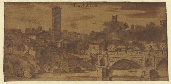 Curator: Looking at this watercolor painting, I'm struck by a sense of tranquility, almost melancholy. The muted colors and soft washes give it a dreamlike quality. Editor: This is Thomas Girtin's "Lancaster Church and Bridge," a work held in the Tate Collections. It's a fascinating example of how topographical art served a public function, documenting places and shaping perceptions of the British landscape. Curator: It feels almost like a stage set, with the bridge and buildings acting as the foreground for the imposing church in the background. The human figures seem so small, dwarfed by the architecture. Editor: Precisely. Girtin was working at a time of significant social and political change. The church, depicted so prominently, represents not just religious authority, but also the established social order. Consider the politics of imagery here: what is Girtin suggesting about power and place? Curator: I see the reflection in the water adding another layer, almost blurring the lines between reality and representation. It invites us to consider the subjectivity inherent in viewing this place. Editor: Exactly. Artworks are shaped by these perceptions. It is important to consider how places are chosen, and the visual language used. Curator: It really makes you think about how we frame history and whose stories get told. Editor: Indeed. It is a reminder that even seemingly simple landscape paintings are embedded within complex cultural contexts.