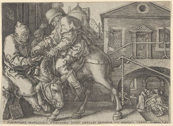 Curator: This engraving, crafted by Giovanni Battista Fontana between 1572 and 1573, depicts "The Death of Titus Tatius". It's currently held in the Rijksmuseum collection. What strikes you initially? Editor: A sense of overwhelming chaos and violence, certainly! The stark lines heighten the drama, making it difficult to discern any single focal point. The overall effect is disturbing. Curator: The artist masterfully utilizes line work, wouldn’t you agree? The density and direction create a sense of movement and spatial depth. Note how Fontana uses hatching and cross-hatching to model the figures and architectural elements. The lines are incredibly precise. Editor: I do see how Fontana builds this depth, yet it also makes me think about the complex power dynamics at play. The subject itself deals with themes of betrayal and political upheaval in the power-hungry world of early Rome, a foundational mythology often employed to bolster dominant ideologies. The violence almost seems ritualistic. Curator: I concede your interpretation, but let us not forget how the arrangement of the figures creates a strong diagonal thrust that draws the eye from the lower left to the upper right. Editor: That’s interesting, considering what is placed there! In the left background, an entire audience looms behind Titus Tatius' murderers. Consider how such violence resonates even now: leaders can meet grisly ends while indifferent crowds watch from the sidelines. It resonates deeply within contemporary social commentary. Curator: It’s a perspective, and your focus on modern parallels gives new richness. However, let us not undermine the fundamental formal strength of the composition itself. Editor: Of course! Still, it makes you reflect upon how artists interpret violence through various media. Fontana, in choosing print, ensured that his version would circulate widely, shaping narratives for years to come, right? Curator: Yes, I find that perhaps its genius. Thank you for your insights; your contemporary connections are stimulating. Editor: Thank you! This just shows how classical works can still provoke important debates when filtered through contemporary discourse.