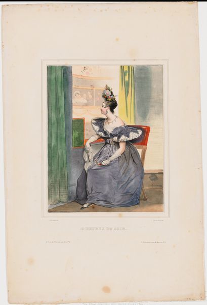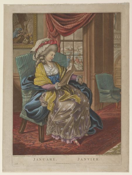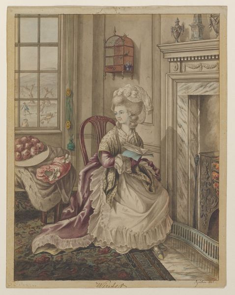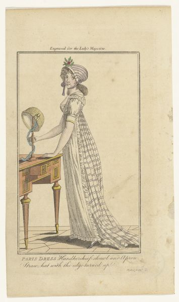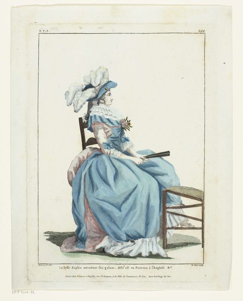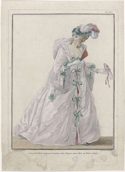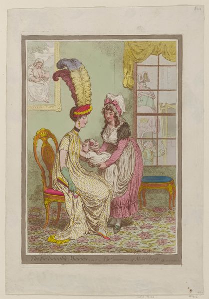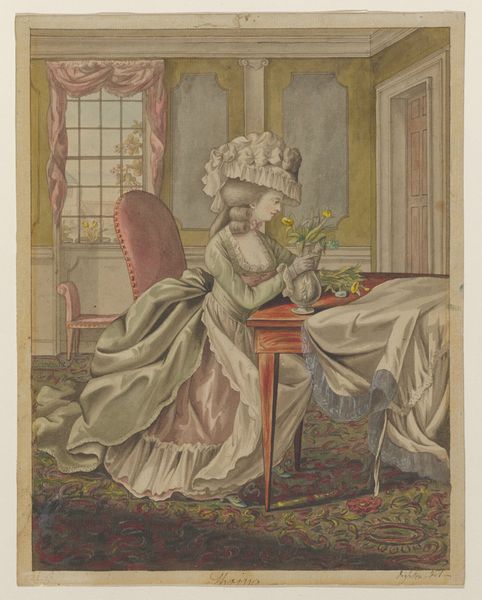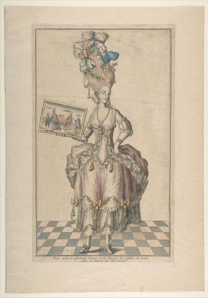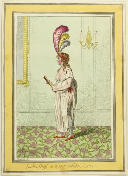 Curator: This is James Gillray's "Modern Elegance, a Portrait," dating back to 1795. It’s a watercolor and print piece currently residing at the Metropolitan Museum of Art. Editor: Initially, the portrait strikes me as somewhat satirical, capturing a distinct late 18th-century aesthetic. There is a definite performative aspect to it. Curator: The romantic era's stylistic signatures are pretty evident. Notice the emphasis on emotion, and in some sense the sublime… how might that contrast with the satirical tone you detected? Editor: Well, isn't that precisely the tension? Gillray critiques, perhaps even mocks, the excessive styles embraced by elite women of the period. Look at the ridiculousness of the feathers in her headdress. These symbols were very much linked to one's gender, wealth, and political affiliation. Curator: Indeed, the visual language here is doing double duty. The towering headdress resonates as a status symbol, as we consider echoes of historical motifs within its elaborate design. Are we perhaps looking at an allegory for the social imbalances of the time, where certain affectations signified privilege and power? Editor: Absolutely, it's a loaded representation of feminine identity. Think about it; she is posed statically with this oversized dress and bonnet—what can this imagery teach us about intersectional discussions around gender, social expectations, and representation during this time? The artist uses line and form to communicate these ideas visually. Curator: Beyond gender critique, it's hard not to notice the deliberate use of light, rendering her dress' fabric. This emphasis is not just showing texture but might also highlight societal surfaces... those outward-facing signs that could belie the substance within. The reflections in the mirror could then serve as literal doubling… internal reality set against social construction. Editor: Precisely, and viewing "Modern Elegance" through a modern lens encourages us to critically assess societal definitions that, in turn, inform our understanding of gender dynamics. By using satire, this portrait does invite contemporary dialogue on historical power structures and biases that persist into current culture. Curator: By studying those embedded symbols, one gleans not only 18th-century norms, but a deeper understanding of image-making as it affects our present moment. Editor: Yes! Looking closer is useful when examining artwork of any age, as it provides insight into not only history but where culture may still need reimagining today.