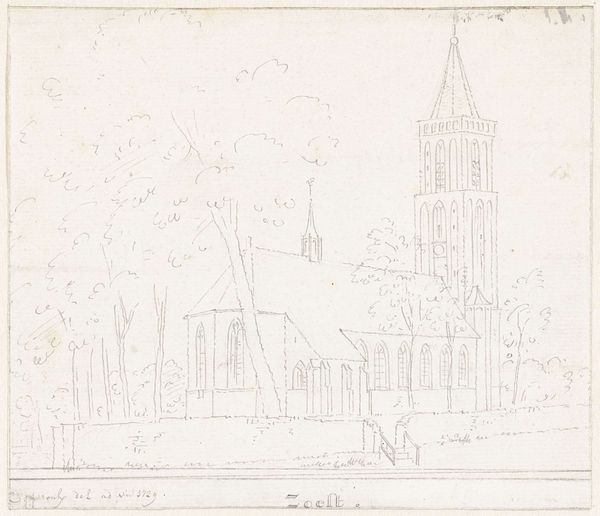 Curator: Before us we have "Gasthuiskerk te Doesburg," a pen and ink drawing on paper attributed to Cornelis Pronk, likely created sometime between 1701 and 1759. It's currently held at the Rijksmuseum. Editor: It feels so ephemeral! The delicate lines, the airy composition... almost like a memory fading into the landscape. I sense a quiet melancholy here. Curator: That resonates with the image’s possible function. These topographical drawings of buildings were often commissioned, serving as a means of documenting the architectural landscape of the time. The church here, then, might stand for something beyond itself. Editor: A visual record for whom, exactly? Wealthy landowners? The Church itself? We need to consider who had the power to commission and control these narratives. Whose perspective is being prioritized? Curator: Well, that’s where it becomes interesting because, though architectural renderings might suggest order, there’s a subtle dynamism to Pronk’s hand. He doesn't render a static, perfected church. Look closely: his quick strokes convey light, atmosphere, a lived-in feeling. And what of the Gasthuiskerk itself? It speaks of civic care, a tangible expression of communal responsibility... Editor: I’m seeing other echoes too... The Church as a refuge, a place of charity… Yet, haven’t such institutions historically perpetuated social hierarchies and inequalities? We can’t look at the beauty of the architectural details without acknowledging this complex and often contradictory history. Curator: Absolutely. And I’d add that those sharp lines evoke something lasting and indelible, despite that ephemeral quality you identified initially. A testament, perhaps, to the endurance of the built environment and its continued impact on the communities that have evolved around it. Editor: So it is not just about capturing physical presence. By recording this landscape, he's capturing the evolution of power and privilege, something always present in these "objective" records of a place and time. Fascinating! Curator: Indeed. I find the contrast between the fleeting impression and the enduring subject particularly evocative. Editor: A stark reminder that even seemingly objective observations are layered with subjective experiences and interpretations. Thank you for sharing.