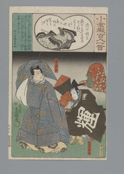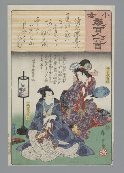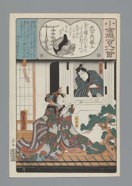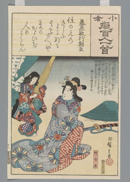 Curator: Here we have Utagawa Hiroshige's "Ogura Imitation of the One Hundred Poems," created between 1847 and 1850. It's currently held in the collection of the Rijksmuseum. Editor: It’s a complex print. The color palette is striking, with its combination of purple, teal, and crimson shades. But what truly catches my attention is how Hiroshige arranges the visual planes, with each adding a narrative layer. Curator: The print showcases the meticulous technique inherent in Ukiyo-e. Note how the blocks create crisp lines, especially in the textile patterns on the figure’s kimono and the rendering of her coiffure. The semiotic weight of this is clear: attention to detail equates social prestige and artistic mastery. Editor: Precisely. The texture suggests labor, from the initial carving to the final printing process. Look at how the details would require painstaking efforts from craftsmen dedicated to the art. It speaks volumes about art production as a collective endeavor. The very existence of "high art" like this depends on a network of skill and production, challenging ideas of singular artistic genius. Curator: One cannot overlook the compositional aspect as a whole. Consider the integration of text and image. It evokes a layered sense, providing insight into a specific time period and its aesthetic values. The figure is an echo of older traditions mediated by Hiroshige's aesthetic. Editor: Right, and from a cultural standpoint, this represents how identities were crafted and portrayed in mass consumption—the commercial realities of the print trade influenced both the artist and the portrayal of his subject. The very idea of orientalism is a consequence. Curator: Viewing this from a formal perspective underscores its innovative nature, in both line and execution. I also find this to be indicative of Hiroshige’s larger stylistic project, placing himself at a pivotal point within the history of Japanese art. Editor: This artwork's ability to spark multiple layers of interrogation only amplifies its legacy. Curator: Yes, the interdisciplinary implications of the work resonate across both its historical context and contemporary assessment.