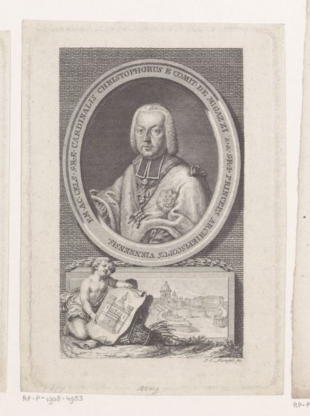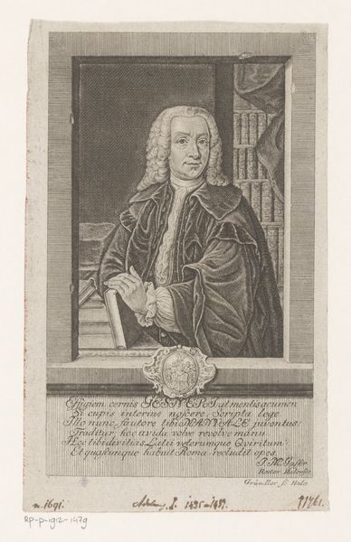 Curator: Looking at this print, I’m struck by its somewhat severe formality. The subject is posed stiffly, despite the slight curve of the draped fabric, a testament to the artist’s attempt at naturalism in portraiture, even though this goal is not fully realised. Editor: Indeed, this formal style, typical of the Baroque period, tells us a great deal about how social standing was visually asserted. This work, created around 1740, is entitled *Portret van Heinrich Christian von Senckenberg*, made by Johann Martin Bernigeroth, here at the Rijksmuseum. Senckenberg’s robe, those subtle, intricate patterns, is less about him than it is about projecting wealth and power. It becomes less a question of character and more about how we read those class structures in society. Curator: But is it only about wealth? I read his gaze as deeply connected to his intellectual life, particularly as a councillor to a regal prince, positioned as he is alongside his library and personal effects. He would be very involved in philosophical and scientific life; his wig the standard fashionable and social uniform, which in today's standards might translate as conformity, but during the Baroque would have translated to high standards of scholarship. Editor: While I understand your reading, it is still imperative that we view it as a deliberate act. A person in that historical time and place made the conscious decision to look like this. The context demands it. What we might see as a personal mark of individuality has to be re-evaluated against social expectations of status, politics and representation. Bernigeroth uses engraving to portray that high position, and does not portray an image of a man reflecting, so we are pushed further away from any possibility of reflection as onlookers ourselves. Curator: A tension, then, between the individual and their role? We see an example of print as a medium and social history entwined, don't we, with Johann Martin Bernigeroth playing with Baroque tradition to immortalize the image of a powerful and important person? Editor: Exactly. This work reminds us how crucial it is to decode those signals within their historical setting in our attempt to assess these artworks and challenge conventions around identity as much now as in the past.