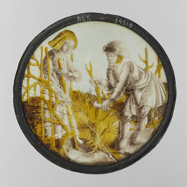 Curator: Look at this roundel depicting the Planet Venus and her Children, crafted between 1517 and 1533. It is attributed to Jörg Breu the Elder. It’s an oil painting on glass. Editor: My first thought is, there’s something unsettling about the scene it portrays. It has a deceptive calm, almost like the quiet before a storm of the late Renaissance kind. Curator: Well, consider that stained glass roundels like this weren't just decorative; they were often part of complex social narratives. This piece offers a snapshot into the ideologies surrounding wealth and power. See how glass, usually associated with religious structures, is here employed for secular display? The artist transforms a sacred material to comment on terrestrial authority. Editor: Absolutely. This domestic scene reflects contemporary values and perhaps anxieties about excess, gender dynamics, and societal hierarchy, which are all relevant in a conversation of a feminist lens. Are the children blessed, or are they caught in a cycle of materialism? The expressions seem almost detached, hinting at potential downsides to worldly privilege. Curator: I agree, and if you look closely, the figures are individualized. There's meticulous detailing in the drapery and expressions—evidence of careful craftsmanship. Also, oil painting on glass! The material challenges must have been intense, suggesting specialized skill and equipment. It reflects a competitive workshop culture where technical excellence could determine patronage. Editor: Also note how race intersects with status in this visual field: these very white figures partake in very comfortable surroundings. Where is race in all of this luxury, which could have emerged due to some imperial expansion and wealth consolidation happening at the time? The narrative becomes an exclusive visual dialogue, and how complicit is this representation? Curator: Right, such artworks were never just passive objects; they played an active role in shaping, sometimes re-shaping, social structures. Considering that the work is made of pigment and glass in an early modern workshop, seeing the artist's process and material agency embedded within it emphasizes that art making can serve and question powerful interests. Editor: Indeed. Thank you for this artful unearthing. Curator: A fascinating analysis! It makes you see so much more.
