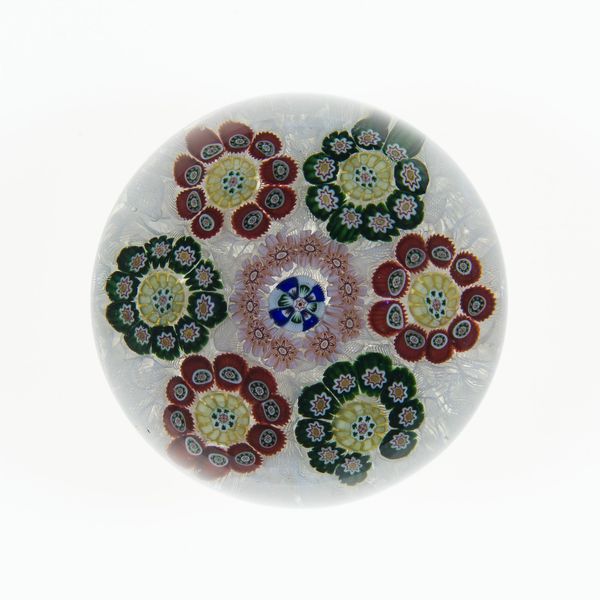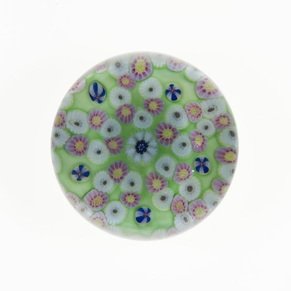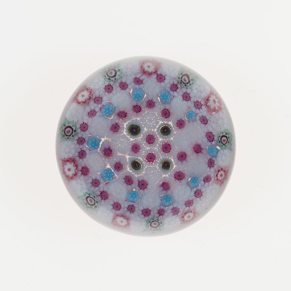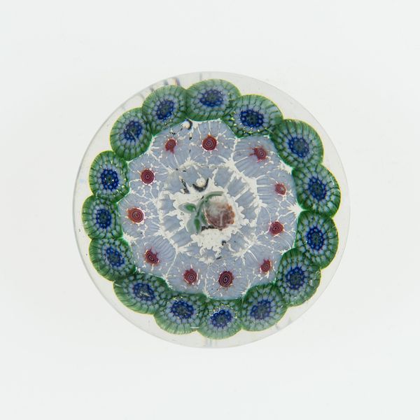 Editor: Here we have a beautiful glass paperweight, created by the Clichy Glasshouse sometime between 1845 and 1860. The little floral design encased inside really gives it a jewel-like quality. What significance do you see in the choice of these embedded flower forms? Curator: This seemingly simple object holds a fascinating depth. Consider the Victorian era, when this was created. Flowers weren't just pretty; they were imbued with meaning. Specific blooms communicated sentiments in a coded language. Roses meant love, daisies innocence, and so on. Editor: So you think this might be a symbolic bouquet frozen in glass? Curator: Possibly! The act of preserving these tiny blossoms also speaks volumes. It is like capturing fleeting beauty, attempting to hold onto a moment in time, much like a memory. This resonates deeply with Victorian mourning practices and their fascination with mementos. And the glass itself… transparent yet solid…it both reveals and protects. Editor: It’s interesting how the function – holding down paper – seems secondary to all of these layered meanings. Curator: Precisely. Everyday objects become vessels for profound emotional and cultural weight. Each little flower then operates as a signifier within a system of established values. It gives a coded representation of larger societal structures of memory and meaning. Editor: That definitely changes how I see it! From just a pretty object to a tiny time capsule filled with cultural meaning. Curator: Exactly! And isn't that the most rewarding part of looking at art, finding those hidden layers?