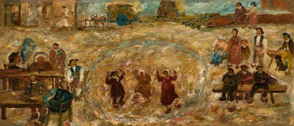 Curator: Tadeusz Makowski’s Źniwa, painted in 1914. We see laborers caught in the middle of their tasks in a golden landscape. Editor: My first thought is of materiality, and the almost tangible texture achieved through impasto and visible brushstrokes; I feel like I can reach out and touch that hay! What stands out to you? Curator: Immediately, it's the symbolic weight of the scene; this tableau encapsulates the cyclical nature of labor, of sustenance. Look at those repeated hat shapes, unifying them. Even their postures echo each other in a rhythm. Editor: That rhythm is driven by hard work. It makes me consider the socioeconomic realities facing these peasants—the material conditions of rural life influencing their very being. Their tools define them as much as the golden hayfield does. Curator: Absolutely. The artist's post-impressionist style, combined with the rural subject matter, reminds me of Millet's obsession with the dignity of labor, though Makowski injects a particular dynamism, a post-impressionistic movement that suggests less stoicism and more immediacy. The figures almost emerge from the field, figures inextricably tied to the land that is painted using similar colors. Editor: It’s true. This isn't idealized; we are presented with a fairly factual snapshot. These are the implements, these the garments, this the exhausting work, presented by means of rough applications and visible marks. I also see an almost naive stylization which elevates everyday life into the symbolic status you mention, don't you think? Curator: Yes! While clearly depicting a specific time and place, the image resonates with a universal quality; it almost transcends its historical moment and gives the viewers an enduring symbolic narrative. Editor: It's amazing to think of all that history and hard labor captured on this single oil-painted canvas. Thanks for bringing this symbolism out! Curator: And thank you for grounding our thoughts in materiality! A fruitful combination, indeed.