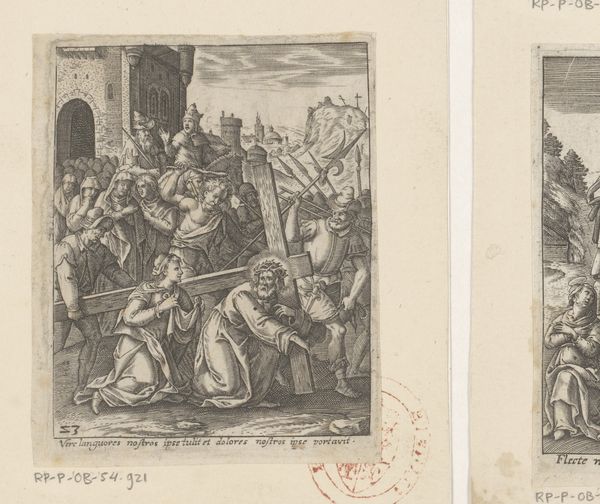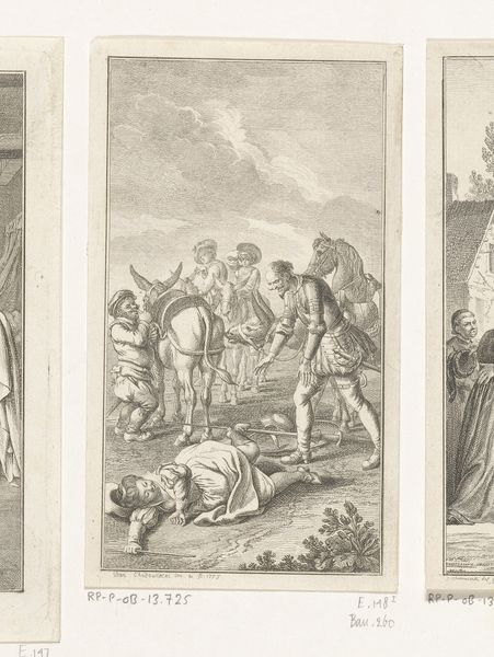 Daniel Nikolaus Chodowiecki made this print, "Engrazia herkent haar oom Don Diego," using etching techniques, which was a popular method for creating detailed and reproducible images in the 18th century. Chodowiecki was a prominent artist in Berlin, and his work often reflected the social and cultural values of the Enlightenment. Here, he illustrates a scene from literature, likely Cervantes’ "Don Quixote." This choice is interesting because Cervantes’ work was a critique of outdated social norms. Consider how the artist uses line and composition to guide our eye, emphasizing the moment of recognition between Engrazia and Don Diego, highlighting personal connections within a broader social fabric. To fully appreciate Chodowiecki’s art, research into 18th-century print culture and the reception of Cervantes in Northern Europe will provide more context. The meaning of this art is always contingent on its social and institutional context.